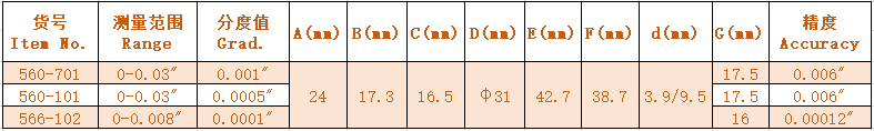 1.Brass body,high diamagnetic property. 2.Adjustable steel dial ring. 3.Jeweled bearing, shock proof. 4.The measuring rod transmission adopts ball bearing construction. 5.With three dovetail slots.