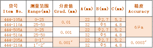 1.用于測量不同管壁的厚度 For measuring the thickness of different tubes. 2.壁厚千分尺測量面組合:腰鼓面-平面(A型) Type A 3.除0-25mm(1")規(guī)格外,其他規(guī)格提供一個校對桿 A calibration rod is supplied for range above 25mm(1").